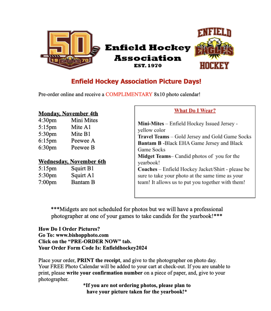 EHA Picture Days are this week. Don't forget to pre-order your pictures. Www.bishopphoto.com and use League Code: enfieldhockey2024.