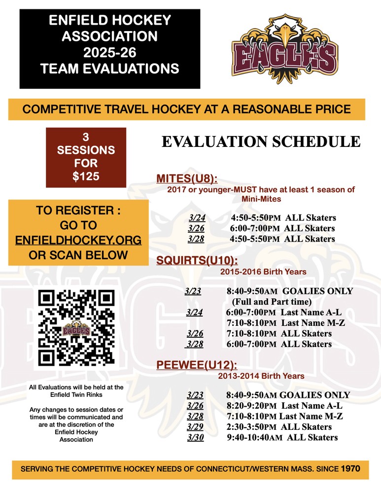 Registration for the Team Evaluations for the 2025-26 Season is now open. See flyer below with dates and times.